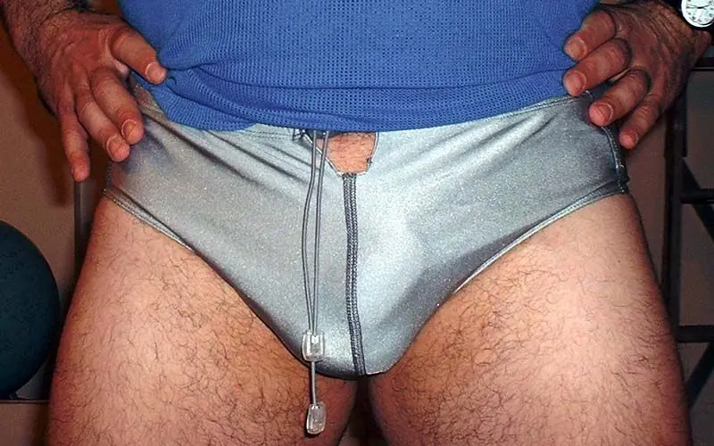 One of my bathing suits at the time: a very gay gray speedo with an opening that shows your hairless crotch:
